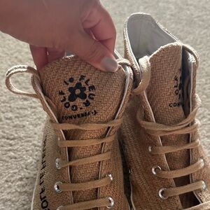 Tyler, the Creator and Converse partnered for a collection influenced on the Chuck 70 High, which included this ‘Fabrice Weave’ iteration. Pointing to the aesthetic of a burlap bag, the tan woven fabric on the upper contrasts with mismatched exterior sidewalls, with Golf Le Fleur spelled out backward on one shoe and a flower icon on the other. The outsole features a black-and-white floral print throughout.
