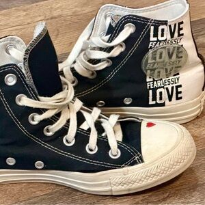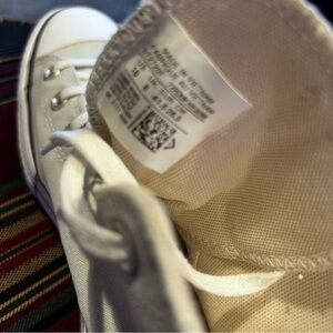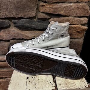 Stylish light gray Converse high-top sneakers. Features classic logo and sturdy build. preowned women’s size 10.