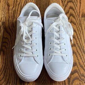 White leather Chuck Taylor Madison OX low top converse all star sneakers, size 7.5. Excellent, barely worn condition. No stains or flaws, very clean. Ships quickly from smoke free/pet friendly home.