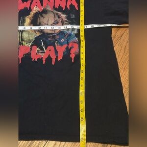 Embrace your love for horror with this Chucky black graphic tee. Featuring the iconic 'Wanna Play?' design, it's perfect for fans of the classic character.