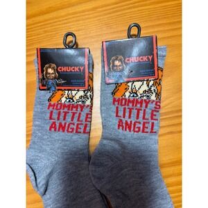 Keywords: Chucky socks, Kids socks, Horror movie socks, Child's Play, Halloween socks, Novelty socks, Mommy's Little Angel, Gray socks, Size 10-4, Children's socks, Movie character socks, Chucky the doll, Horror themed, Kids clothing