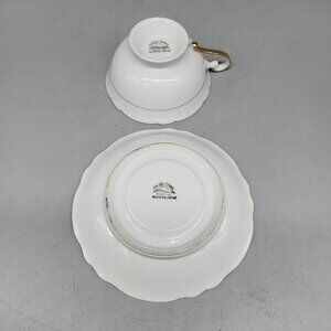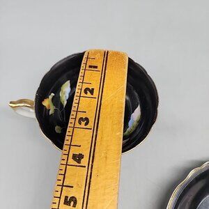 This vintage Chugai China demitasse teacup and saucer set features a round design with a black glossy finish and a floral pattern. Produced in 1945 in Occupied Japan, this decorative tea cup and saucer set is perfect for all occasions. Made of porcelain, this original set is a unique addition to any tea lover's collection, with a printed backstamp adding to its charm. Hand wash only to preserve the intricate details of this art pottery piece.
