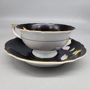 Chugai China Demitasse Teacup & Saucer Rise Floral Black Occupied Japan Vintage