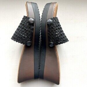 CHULA Black Mesh Slide Sandals with Brown Wedge Heels Women’s Size 9. The top black mesh has 4 working snaps on each sandal so can it interchanged with other Chula sandal top (no extra straps included). Sandals in good condition. Please consider bundling for the best deal. Thank you for shopping.