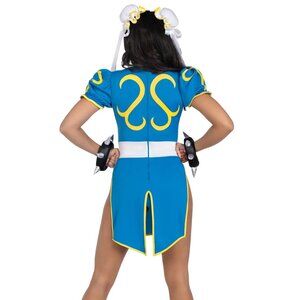 Step into the ring as one of the most legendary video game heroines with the 3 PC Chun-Li Costume. Designed to capture her powerful presence and iconic style, this set includes a bodysuit dress with signature blue and gold character detailing, spiked wrist cuffs, and bun covers adorned with ribbon accents.