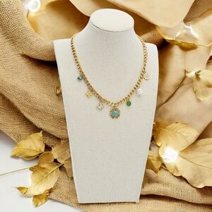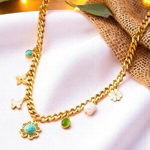 Add a playful sparkle to your neckline with this eye-catching charm necklace! Featuring a luxe 18K gold plated stainless steel chain, this statement piece is adorned with colorful charms—like turquoise and green gemstone accents, floral motifs, butterflies, and a luminous faux pearl. Designed to dazzle on its own or layer up for a bold Y2K vibe, it's the perfect addition to your jewelry collection. Great for gifting or dressing up your everyday look!