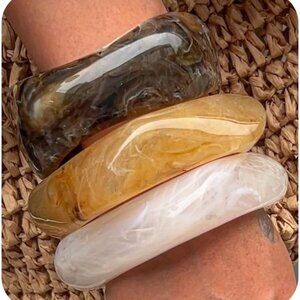 Features: This set includes three chunky resin bangles with irregular geometric shapes in vibrant colors. The mixed hues and bold design add a fun, artistic touch to any look. Smooth inner surface, lightweight, and perfect for everyday wear or special occasions.