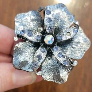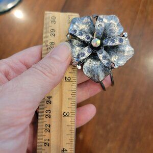 The bracelet features a large, antiqued metal flower design, adorned with small rhinestones, set on a clamper-style bangle. The flower is the focal point, with textured petals and a central cluster of rhinestones.