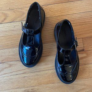 Black patent-leather Mary Jane style women's loafers, size 6.5 Adorable t-strap silver buckle. Very good condition.