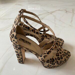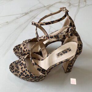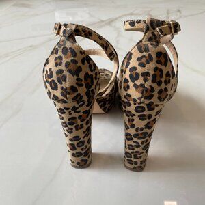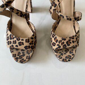 Chunky Block Heel Strappy Sandals Faux Suede Leopard Cheetah Animal Print Sz 10