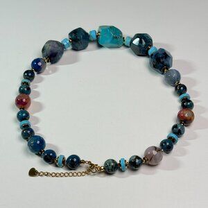 Unique handmade statement necklace featuring chunky blue gemstones, turquoise-style center beads, and gold accents.