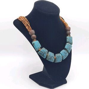 Chunky Bohemian Turquoise Amber Resin Square Beaded Statement Necklace 22" XLNT