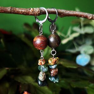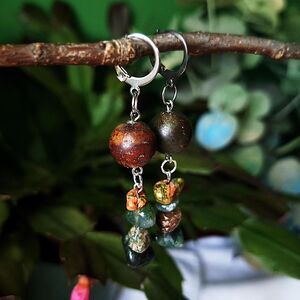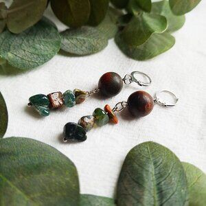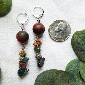 These bold, rustic earrings are handmade with raw stone energy and deep forest colors. Featuring chunky Cherry Creek jasper, Indian agate chips, and unakite, they’re grounded in natural beauty and perfect for those who love forest trails, granola-core adventures, or witchy pagan flair.