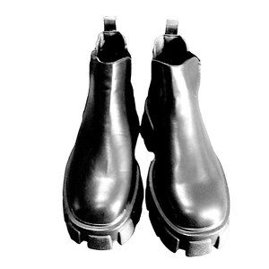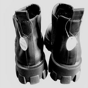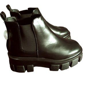 Listed for sale is a Pair of Truffle Collection Black Wide Fit Goth Chelsea Ankle Boots. The Boots Feature a Platform Bottom, Round Toe, Chunky Lugged Sole, Pull Tab for easy entry and elasticized inserts. The Left boots had a tiny faded area on the toe near the bottom that was covered with Kiwi Scuff Cover. Barely Noticeable but I wanted the Buyer to know before purchase. Please see photos with arrows.