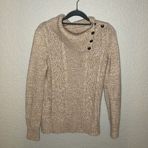 Chunky Cable Knit Heathered Beige Tan Button Fold Over Cowl Neck Sweater