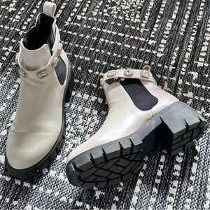 Step up your style with these bold and edgy Chelsea ankle boots. Crafted in smooth white leather, they feature elastic side panels for a classic fit and chunky black lug soles for comfort and traction. A standout detail is the jeweled strap across the ankle, embellished with sparkling rhinestones that add a glamorous twist to the rugged silhouette. Perfect for pairing with jeans, dresses, or layered streetwear looks, these boots combine durability with fashion-forward flair.