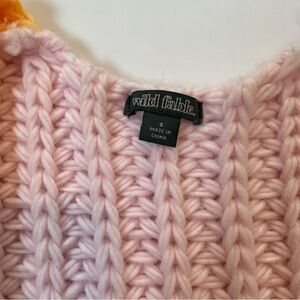 Fun chunky knit cardigan with orange, purple, and pink color blocking. Very light wear to the knit. Acrylic. Size Small