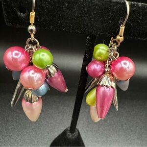 Super cute and fun dangly drop earrings in pastel pinks, blues, greens, and darker pink plastic beads with silver tone caps and hardware