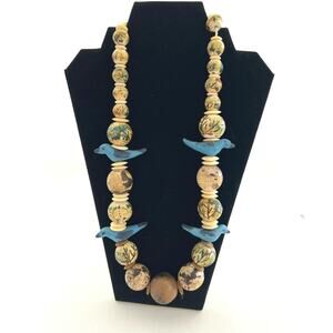 Birds: Several carved, blue bird-shaped beads are integrated into the necklace design, adding a distinct thematic element.