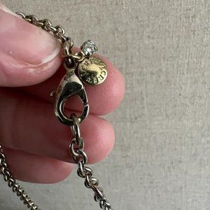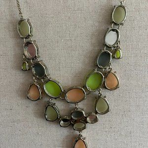 This fun statement necklace features a gold chain with green, gray, pink and rhinestone pieces. Measures 19-22 inches.