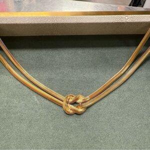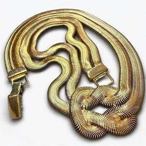 Make a bold impression with this stunning vintage-inspired gold-tone necklace. Featuring three flat herringbone strands intricately intertwined in a dramatic central knot, this piece exudes timeless elegance and artistic flair. The sleek, high-shine finish and structured design give it a luxurious feel, perfect for dressing up any outfit—from formal looks to glam evening wear.