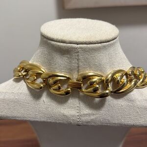 Shiny gold tone open link chunky collar necklace with fold over clasp. Sits flat on the neck. Mob wife style.