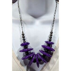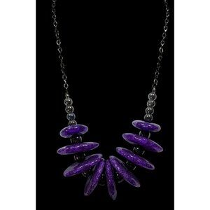 Elevate your style with this Chunky Gothic Purple Crackle Disc Statement Necklace. Its unique design and bold color make it a perfect accessory for any occasion.
