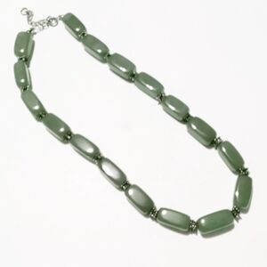 This gorgeous necklace is fashioned with large polished green aventurine beads accented by silver tone spacer beads for a touch of shimmer. The vibrant natural green hues of the aventurine give this piece an earthy yet elegant appeal. The necklace measures 16" in length with an additional 2" extender chain and fastens securely with a spring clasp. Each bead measures approximately 21mm long by 10mm wide. In beautiful condition — a striking statement necklace that adds a natural sophistication to any look.