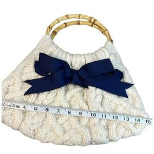 Chunky Hand Knit Cream with Navy Bow Coquette Girl Style Top Handle Handbag