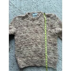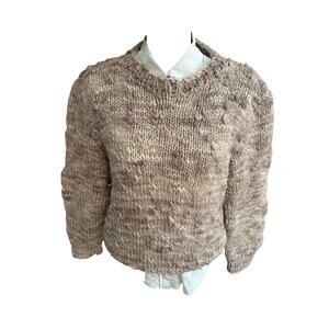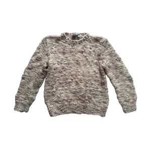 Beautiful chunky hand-knit wool sweater in a neutral beige and taupe marled tone. Crafted from 100% pure wool with a soft, nubby bobble texture and cozy heavyweight feel. Features a crew neckline, ribbed cuffs and hem, and a relaxed fit perfect for layering.