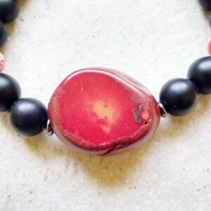 This big, substantial and heavy bracelet features a striking contrast between the deep red Coral Focal Bead, large matte black stone beads and red speckled Jasper disc beads. It is heavy, solid and made for the average wrist @ 7". This is an elastic stretch bracelet - easy roll on/off without the hassle of chipping your nail polish on a clasp.