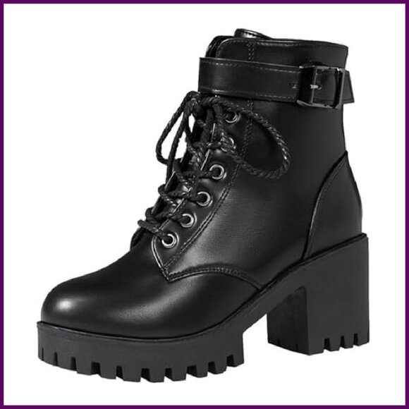 • Style: Lace-up closure with adjustable buckle strap and a convenient side zipper for easy on and off. Features a chunky heel and platform sole with a non-slip lug outsole for a goth-inspired aesthetic.