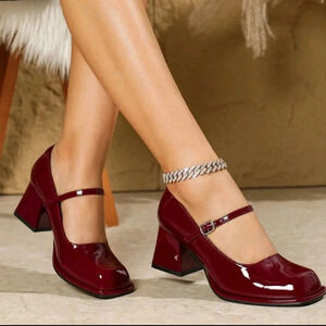 Chunky Heeled Mary Jane Shoes, Round Toe Red/Burgundy