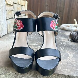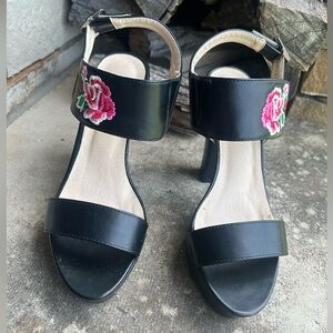 Chunky Heels Forever embroidered flower black heels. Sz-7. Os