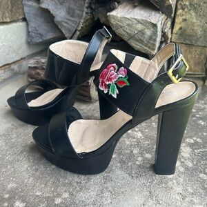 Chunky Heels Forever embroidered flower black heels. Sz-7. Os