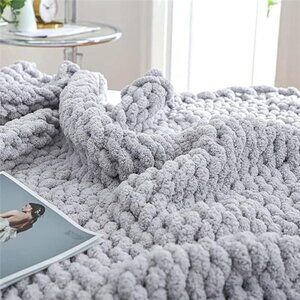 Chunky Knit Blanket Throw 51"x63", 100% Hand Knitted Chenille Throw Blanket