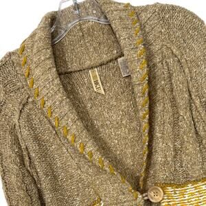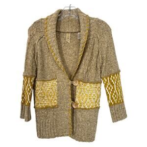 Women's 2-button heavyweight knit cardigan sweater in goldish tones (mustard yellow/tan) with cable-knit and ikat details. Shawl collar with whipstitch edging, 3/4 sleeves. Buckle BKE Size S