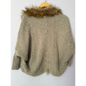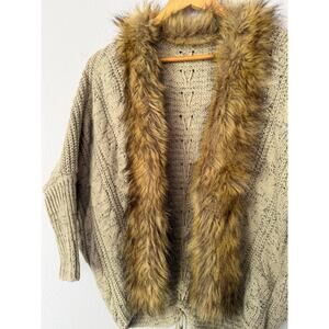 Chunky Knit Cardigan Sweater Faux Fur Trim Collar Cozy oversize Beige Women M/L