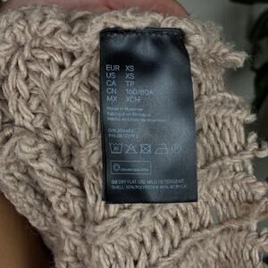 Excellent condition neutral tan chunky knit turtle neck sweater. Cropped on the bottom and neck with rough fringe edges. Super warm material thats perfect for winter. Tag removed but I believe from fabric tag its from H&M.