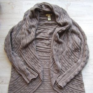 Fall in love with this long sleeve shawl collar sweater. Beautiful knit details. Shorter in the front, longer in the back. Warm taupe color. Material is 100% cotton.