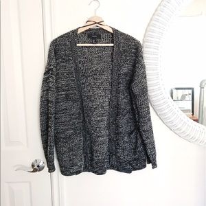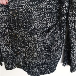 So cozy! Chunky knit black sweater, front pocket detail, button down the front. Loose fit, super easy to style.