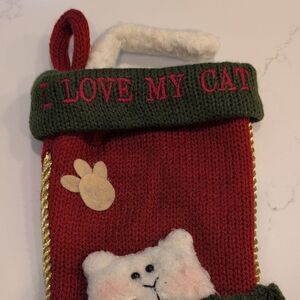 Chunky Knit Embroidered I Love My Cat Red and Green Christmas Stocking.