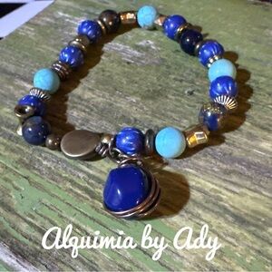 Chunky Lapis lazuli turquoise beaded gemstone charms brass bracelet