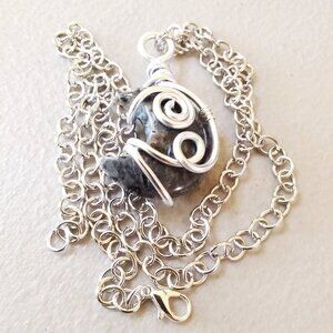 This crescent moon pendant is made from Larvikite - a kissin' cousin to Labradorite - just in black, gray & silver instead of other colors. The actual color appearance of the stone varies with the lighting + the color of your clothes - - - and can appear from silverish gray to almost black. See the pics of the same pendant on various backgrounds to get an idea. This pendant has been wire wrapped with extra thick aluminum jewelry wire. I added a 24" adjustable stainless steel chain to it; simply click the lobster claw clasp into any link to adjust it to your neckline.