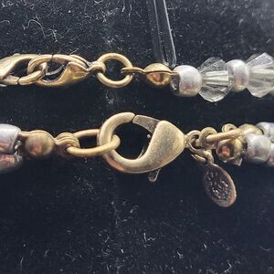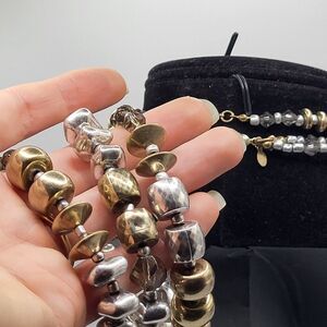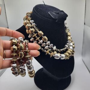 Chunky Metallic Beaded Necklace & Bracelet Demi Parure 17in | Materials: silver metallic, gold metallic chunky beads | Length: necklace 17in, 7in bracelet | Clasp: slide on stretchy, lobster clasp | Signed? Crown logo | Excellent vintage condition