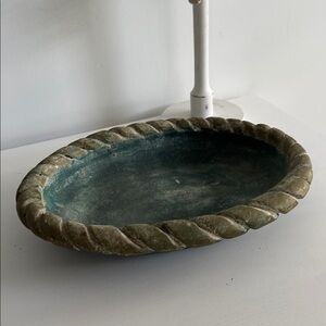 This is a gorgeous chunky terracotta plate with beautiful green hues, very rustic, bohemian, southwest style plate/bowl. Great decor piece for your home. Great layering piece for a coffee table or kitchen counter.