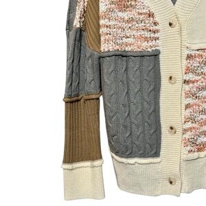 Chunky Mixed Media Long Sleeve Hooded Button Front Boho Sweater Cardigan Large