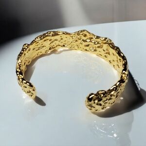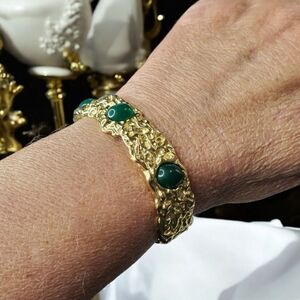 Exquisite Chunky Molten Gold Plate Cuff Bracelet with Beautiful Emerald Cabochons