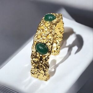 Chunky Molten Gold Emerald Cabochon Bangle Cuff Bracelet