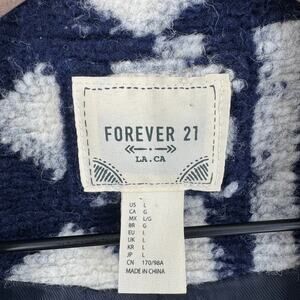Forever 21 longline coat in a striking navy and cream geometric pattern. Soft, textured fabric with a cozy feel and full lining for added warmth. Features a single-button front, notched collar, and side pockets. A bold boho-inspired statement layer perfect for fall and winter.